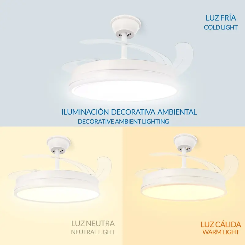 Este ventilador de techo combina funcionalidad y estilo. Incluye una luz LED blanca,mando a distancia y motor DC.Ofrece6velocidadesajustablesparauncontrol personalizado.Su diseno silencioso garantiza un ambiente tranquilo. Las aspas retráctiles anaden