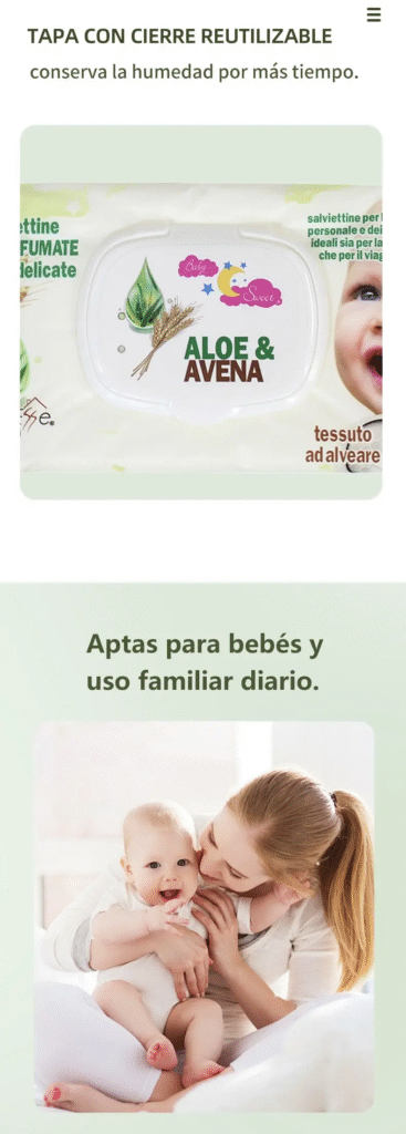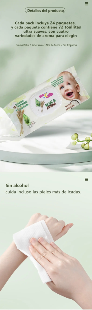 Extra suaves para tu delicada piel. Disponibles en 5 fragancias: Aloe Vera, Aloe & avena, Crema baby y Sin fragancia. SIN ALCOHOL; ideales para cuidar la piel de tu pequeno.